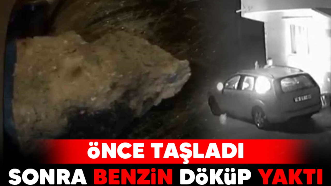 Aralarında husumet olan kişinin otomobilini önce taşlayıp camını kıran ardından benzin döküp yakan kişi güvenlik kamerasına anbean yansıdı.