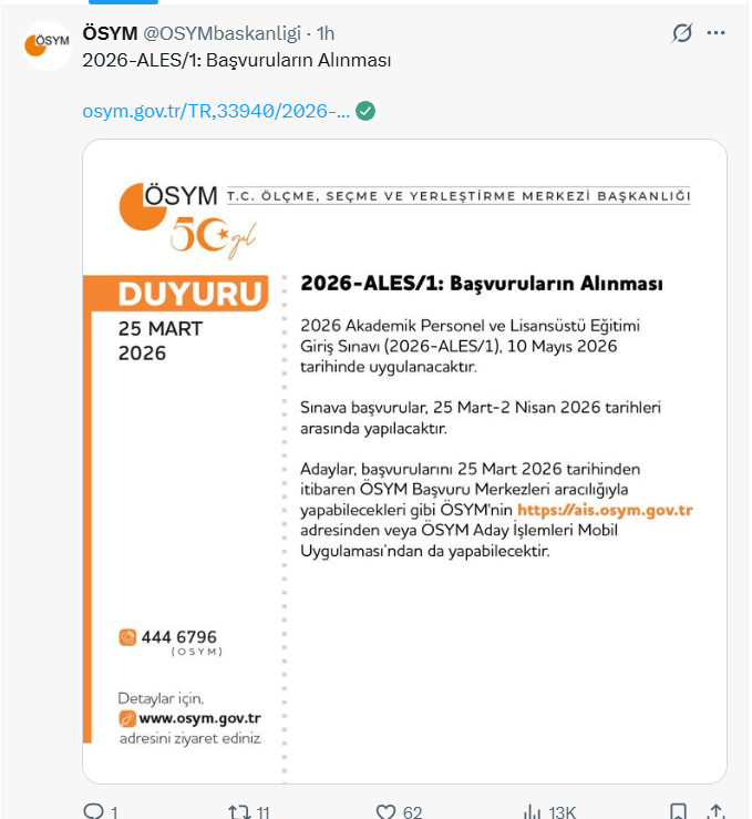 ÖSYM tarafından yapılan paylaşımda, 10 Mayıs Pazar günü gerçekleştirilecek 2026-ALES/1 için başvuru sürecinin başladığı belirtilirken adayların başvurularını 2 Nisan Perşembe gününe kadar tamamlayabileceği ifade edildi.