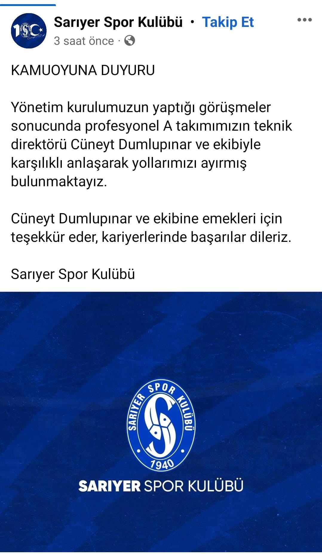 "Yönetim kurulumuzun yaptığı görüşmeler sonucunda profesyonel A takımımızın teknik direktörü Cüneyt Dumlupınar ve ekibiyle karşılıklı anlaşarak yollarımızı ayırmış bulunmaktayız.