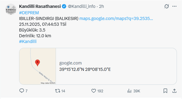 Sosya medya hesabı üzerinden yapılan paylaşım Sındırgı merkezli depremin saat 07.44'te gerçekleştiği belirtildi. Kandilli depremin 3.5 büyüklüğünde meydana geldiğini açıklarken derinliğini 12.0 kilometre olarak kaydetti.