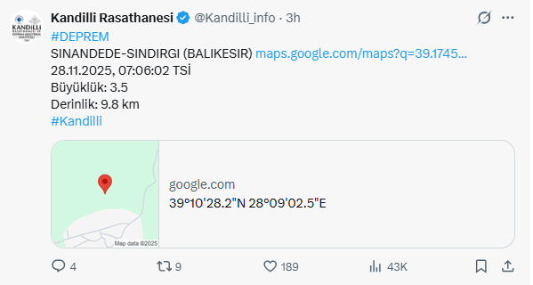 Yapılan paylaşımda depremin saat 07.06'da 3.5 büyüklüğünde gerçekleştiği belirtildi. Sındırgı merkezli deprem yerin 9.8 kilometre derinliğinde kaydedildi.