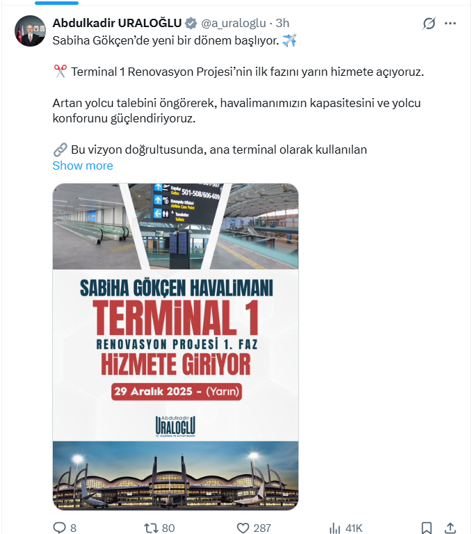 “Terminal 1 Renovasyon Projesi’nin ilk fazını yarın hizmete açıyoruz” diyerek yeni hizmeti duyuran Bakan Uraloğlu, paylaşımında şu ifadelere yer verdi: