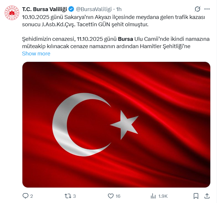 10.10.2025 günü Sakarya’nın Akyazı ilçesinde meydana gelen trafik kazası sonucu J.Asb.Kd.Çvş. Tacettin GÜN şehit olmuştur. Şehidimizin cenazesi, 11.10.2025 günü Bursa Ulu Camii’nde ikindi namazına müteakip kılınacak cenaze namazının ardından Hamitler Şehitliği’ne defnedilecektir. Aziz şehidimize Allah’tan rahmet, ailesine ve milletimize sabır ve başsağlığı diliyoruz.
