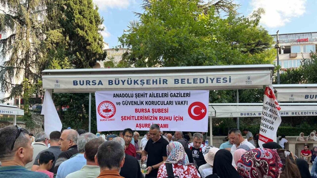 Anadolu Şehit Aileleri Gazileri ve Güvenlik Korucuları Vakfı (AŞAV) Bursa Şubesi, şehitlerin hayrına Bursa Ulu Cami avlusunda binlerce vatandaşa aşure ikram etti.