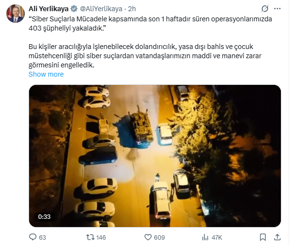 “Milletimizin yanındayız. Sizler için bu suç şebekeleriyle mücadelemizi aralıksız sürdürüyoruz. Lütfen daha dikkatli olalım. Şüphelendiğiniz bir durumda hemen 112 Acil Çağrı Merkezimizi arayın. Biz gereğini yaparız.”