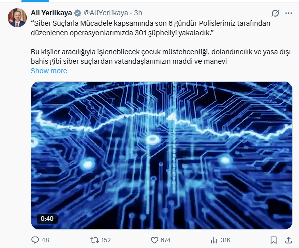 Bakan Yerlikaya, operasyonlar sayesinde çocuk müstehcenliği, dolandırıcılık ve yasa dışı bahis gibi siber suçlar aracılığıyla vatandaşların maddi ve manevi zarar görmesinin önüne geçildiğini belirtti.