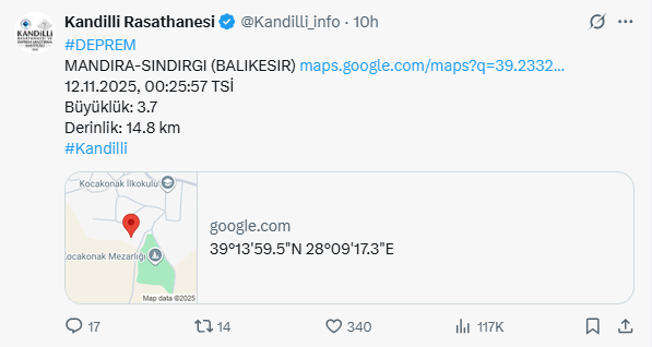 Kandilli Rasathanesi’nin sosyal medya hesabından yapılan paylaşıma göre, Balıkesir’in Sındırgı ilçesinde saat 00.25’te 3,7 büyüklüğünde bir deprem meydana geldi. Depremin yerin yaklaşık 14,8 kilometre derinliğinde gerçekleştiği belirtildi.