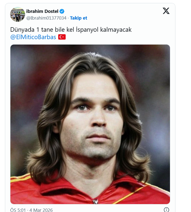 Bir Türk X kullanıcısının paylaşımı ise tüm dünyada gündem olmuştu. Paylaşımında, "Dünyada 1 tane bile kel İspanyol kalmayacak" ifadelerini kullanan ve aslında saçı olmayan efsane İspanyol futbolcu Andres Iniesta'nın uzun saçlı bir görselini paylaştı.