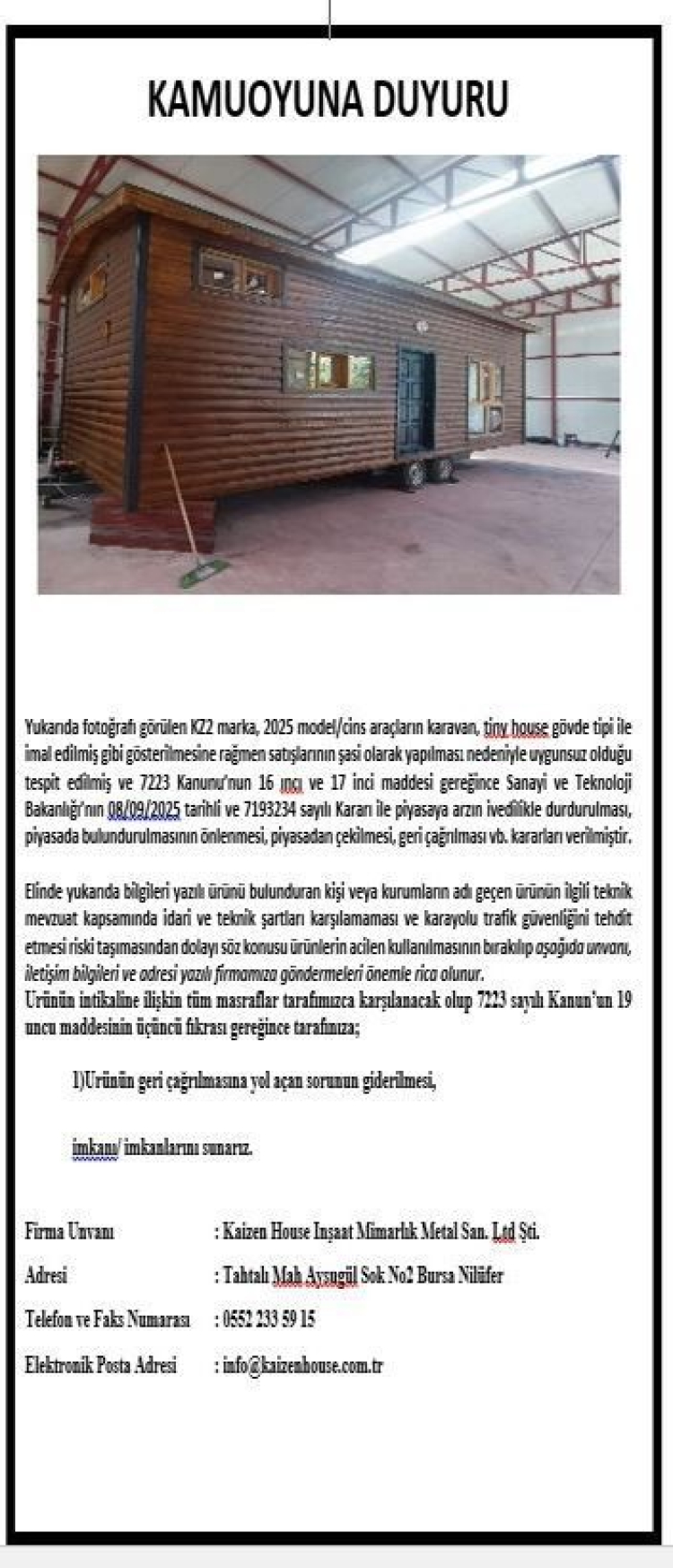 Sanayi ve Teknoloji Bakanlığı Bursa İl Müdürlüğü tarafından yapılan denetimler sonucunda, Kaizen House İnşaat Mimarlık Metal Sanayi Limited Şirketi’ne ait 2025 model KZ2 serisi araçların, karavan veya tiny house tipi olarak tanıtılmasına rağmen satışlarının yalnızca şasi şeklinde gerçekleştirildiği belirlendi.