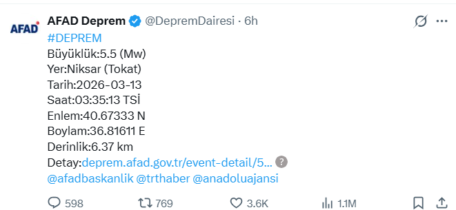 AFAD'ın sosyal medya hesabı üzerinden paylaştığı verilerine göre saat 03.35'te merkez üssü Tokat'ın Niksar ilçesi olan 5,5 büyüklüğünde deprem meydana geldi. Yerin 6.37 kilometre derinliğinde gerçekleşen deprem Tokat ve çevre illerden hissedildi.