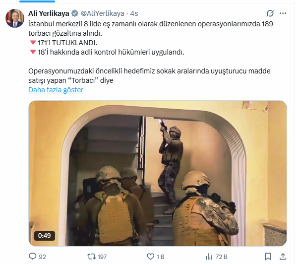 Paylaşımında uyuşturucunun bir insanlık suçu olduğunu vurgulayan Bakan Yerlikaya, "Bizim bütün mücadelemiz, bir insanlık suçu olan uyuşturucudan, başta gençlerimiz olmak üzere tüm vatandaşlarımızı korumak. Ve biz bu mücadeleyi, sadece ülkemiz için değil, tüm insanlık için yapıyoruz." ifadelerini kullandı.