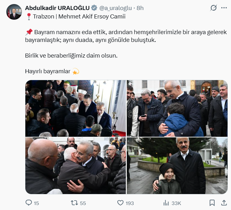Sosyal medya hesabından paylaşım yapan Uraloğlu, aynı duada ve aynı gönülde buluşmanın önemine vurgu yaparak birlik ve beraberlik temennisinde bulundu ve tüm vatandaşların bayramını kutladı.