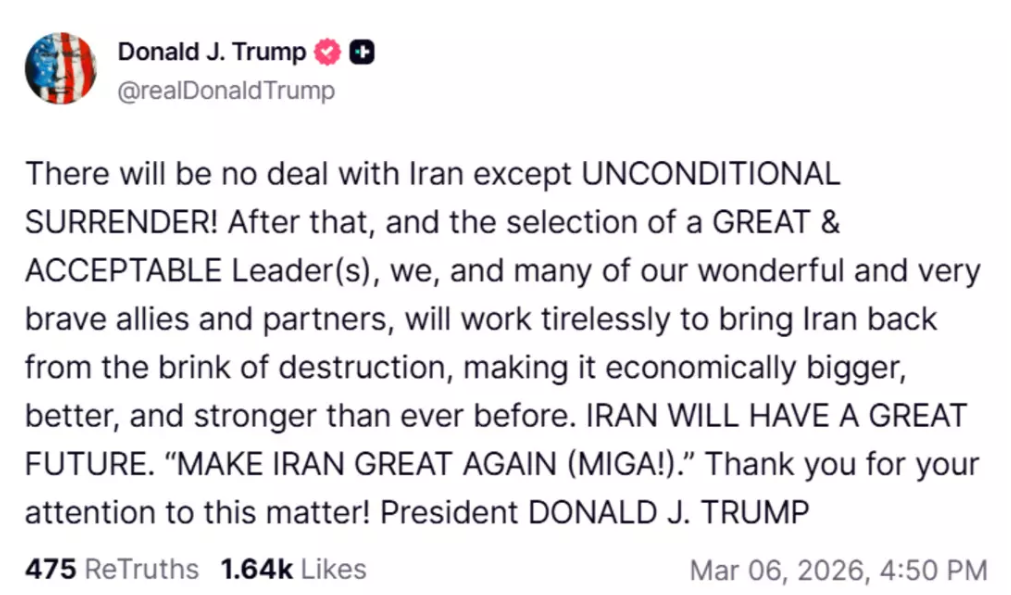 Trump, Truth Social hesabından yaptığı paylaşımda "İran ile KOŞULSUZ TESLİM OLMA dışında hiçbir anlaşma yapılmayacaktır!" dedi.