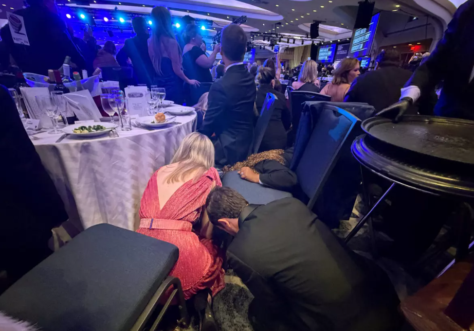 Canlı yayında gerçekleşen programda, servis başladıktan hemen sonra sesler yükseldi; Donald Trump’ın güvenlik ekibi uzun namlulu silahlarla sahneye çıktı. Davetliler de panik halde masaların altına girerek kendilerini korumaya çalıştı.