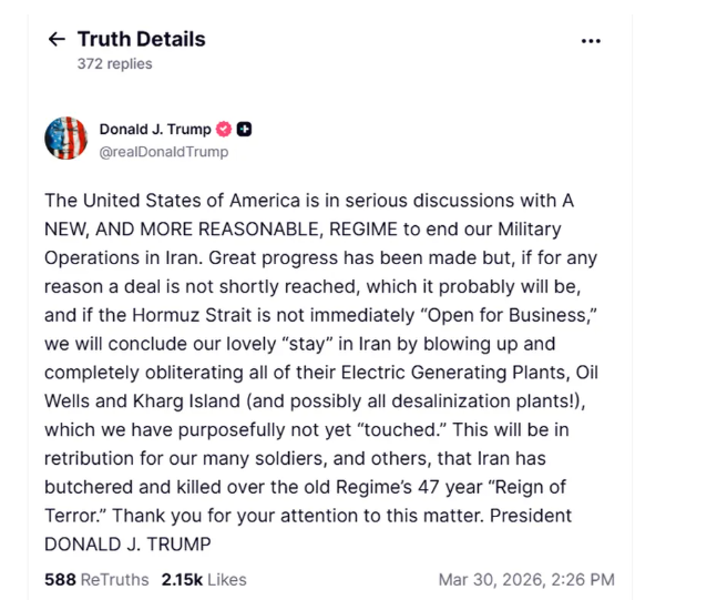 ABD Başkanı, "Amerika Birleşik Devletleri, İran'daki askeri operasyonlarımızı sona erdirmek için yeni ve daha makul bir rejim ile ciddi görüşmeler yürütmektedir. Büyük ilerleme kaydedildi, ancak herhangi bir nedenle kısa süre içinde bir anlaşmaya varılamazsa (ki muhtemelen varılacaktır) ve Hürmüz Boğazı hemen ticarete açılmazsa İran'daki tüm elektrik tesislerini, petrol kuyularını ve Hark Adası'nı tamamen yok ederek sonlandıracağız." ifadelerinde bulundu.