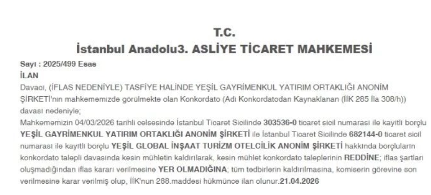 İcra ve İflas Kanunu’nun 288. maddesi uyarınca kamuoyuna duyurulan bu karar, piyasalardaki belirsizliği de ortadan kaldırdı. Mahkeme kararıyla birlikte Yeşil GYO ve Yeşil Global İnşaat’ın ticari faaliyetlerine engel teşkil eden yasal süreçler son bulmuş oldu.