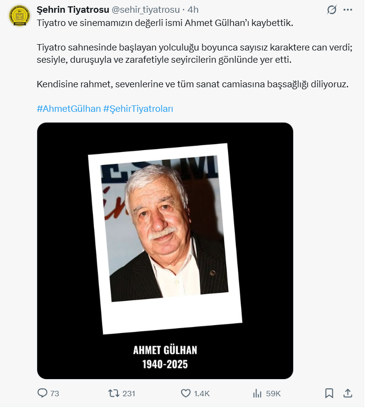 Türk tiyatrosunun unutulmaz isimlerinden ve Devekuşu Kabare'nin üç kurucusundan biri olan Ahmet Gülhan, 85 yaşında yaşamını yitirdi.