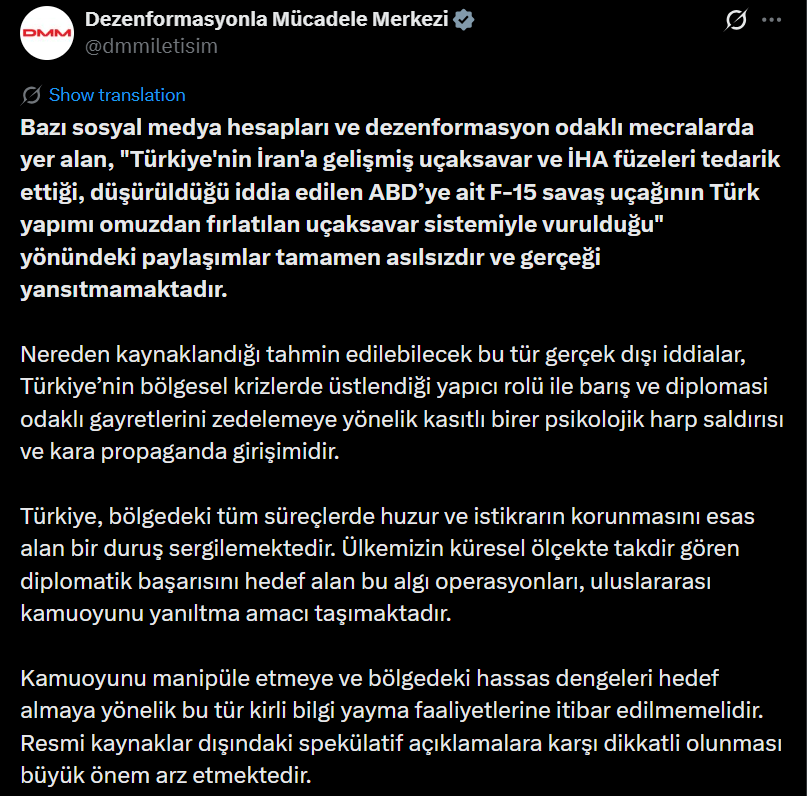 DMM tarafından yapılan açıklamada, “ABD’ye ait olduğu iddia edilen F-15 savaş uçağının Türk yapımı omuzdan atılan uçaksavar sistemiyle vurulduğu” yönündeki paylaşımların tamamen asılsız olduğu vurgulandı.