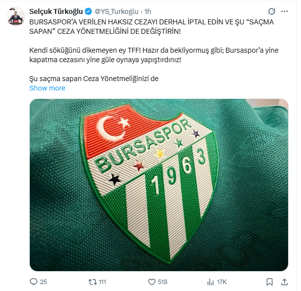 Türkoğlu, paylaşımında TFF’ye yönelik eleştirilerde bulunarak, federasyonun “kendi sorunlarını çözemediğini” ancak Bursaspor’a ceza vermekte aceleci davrandığını ifade etti. "Kendi söküğünü dikemeyen ey TFF! Hazır da bekliyormuş gibi; Bursaspor’a yine kapatma cezasını yine güle oynaya yapıştırdınız!" diyen Türkoğlu, mevcut ceza yönetmeliğinin de değişmesi gerektiğini vurguladı.