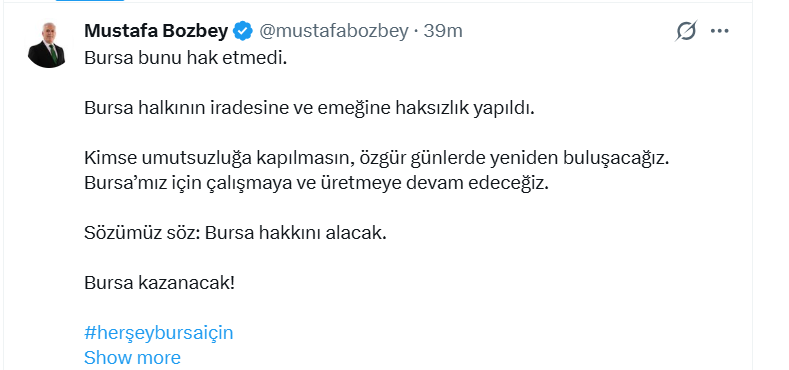 "Kimse umutsuzluğa kapılmasın, özgür günlerde yeniden buluşacağız. Bursa’mız için çalışmaya ve üretmeye devam edeceğiz" ifadeleri kullanıldı. Mesajda ayrıca, "Sözümüz söz: Bursa hakkını alacak. Bursa kazanacak" cümleleri yer aldı. Paylaşım, Mustafa Bozbey'in adıyla kullanılan sosyal medya hesapları üzerinden kamuoyuna duyuruldu.