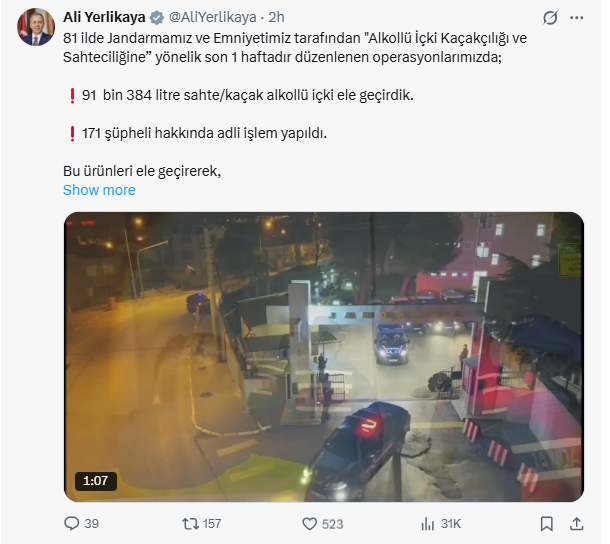 Bakan Yerlikaya paylaşımında, "Sahte alkol üretimine yönelik operasyonlarımızı 81 ilimizde aralıksız sürdürüyoruz. Lütfen şüpheli durumları 112 Acil Çağrı Merkezimize bildirin. Biz Gereğini Yapalım." çağrısında bulundu.