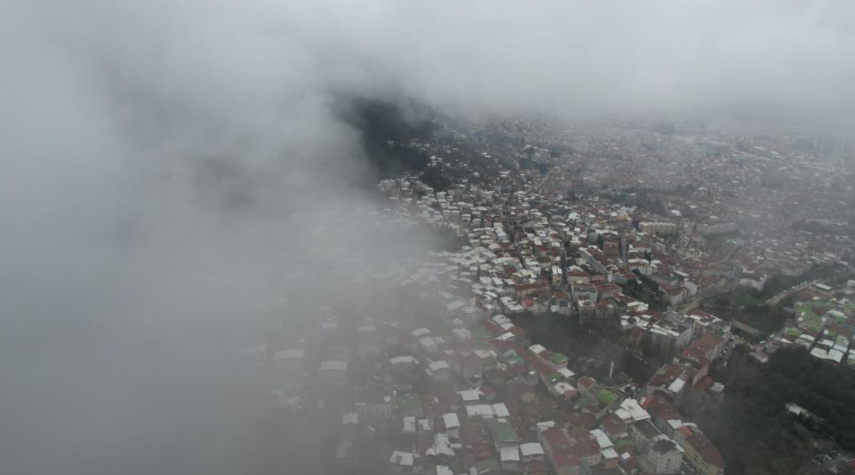 Özellikle Uludağ yamaçlarından şehir merkezine doğru ilerleyen sis bulutları, kenti adeta beyaz bir örtüyle kapladı.