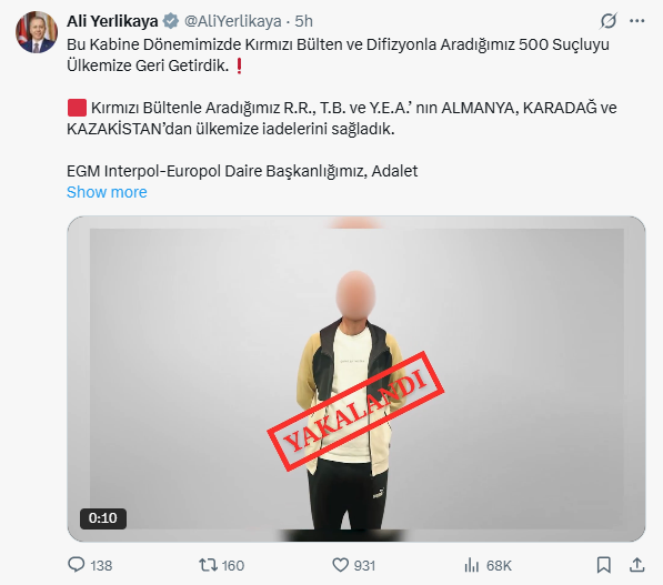 Yerlikaya, Emniyet Genel Müdürlüğü Interpol–Europol Daire Başkanlığı, Adalet Bakanlığı görevlileri, İstihbarat ile Narkotik Suçlarla Mücadele ve Asayiş Daire Başkanlıklarının koordinasyonunda yürütülen çalışmalar sonucu yurt dışına kaçan ve haklarında arama kararı bulunan şahısların titizlikle takip edildiğini belirtti. İlgili ülkelerin kolluk birimleriyle ortak operasyonel işbirliği sayesinde şu iadelerin sağlandığını açıkladı: