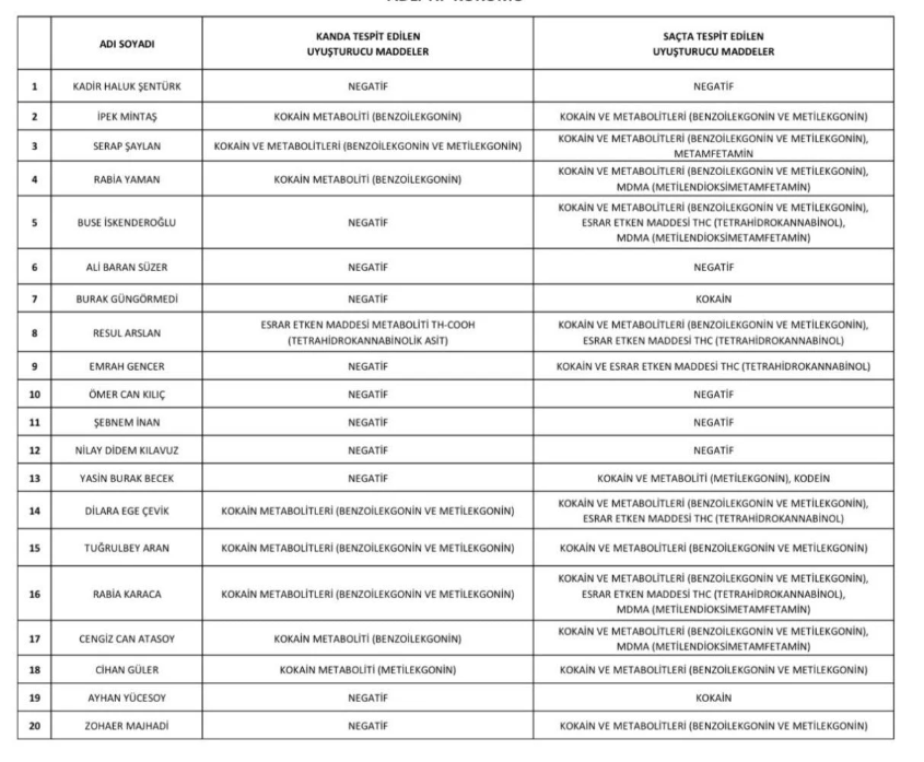 Adli Tıp Kurumu tarafından hazırlanan rapora göre, bazı şüphelilerin kan testleri temiz çıkmasına rağmen saç örneklerinde uyuşturucu madde ve metabolitlerine rastlandı. İncelemelerde özellikle kokain ve türevleri olan benzoilekgonin ile metilekgonin, esrarın etken maddesi THC ve bazı kişilerde MDMA (metilendioksimetamfetamin) tespit edildi.