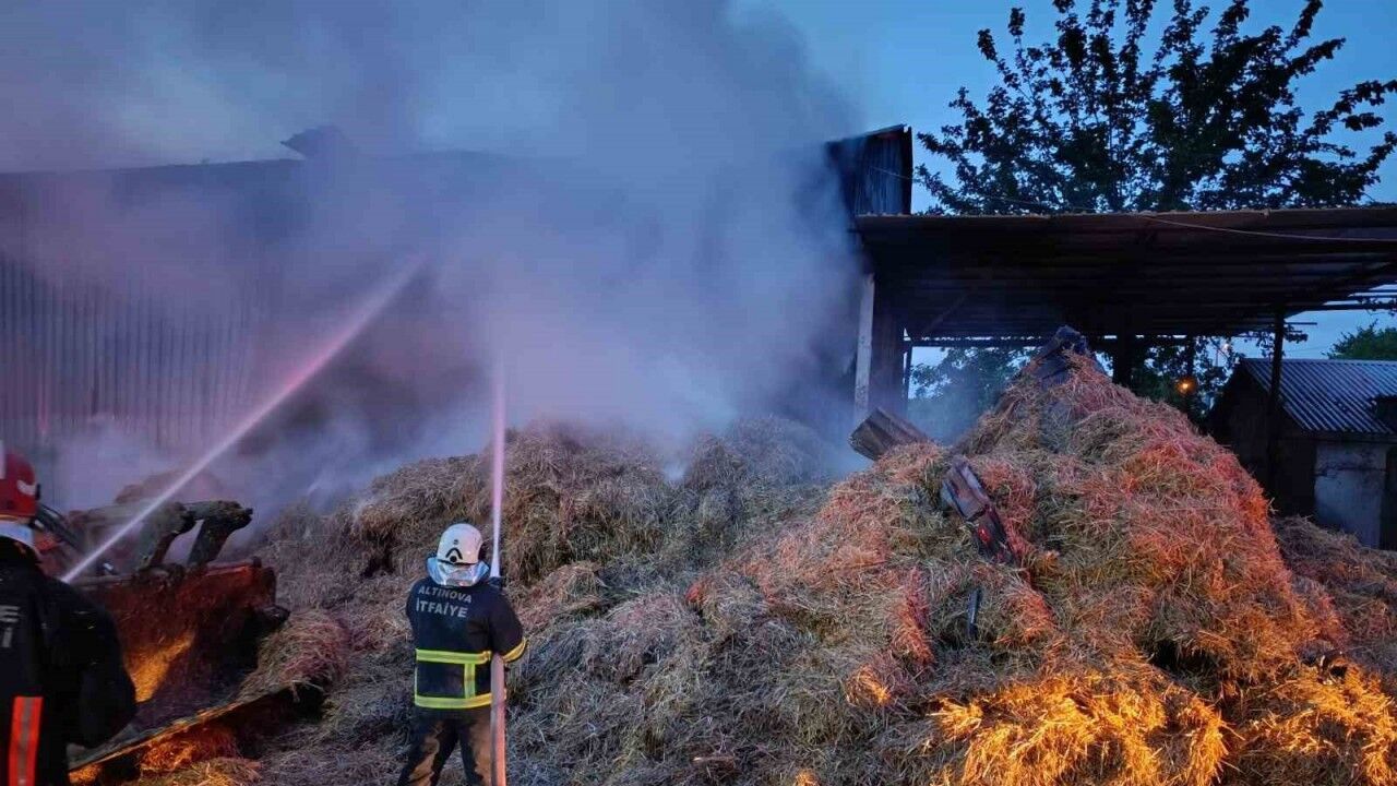 Yalova’nın Altınova ilçesi Ayazma köyünde saman depolanan hangarda çıkan yangın, itfaiye ekipleri tarafından söndürüldü.