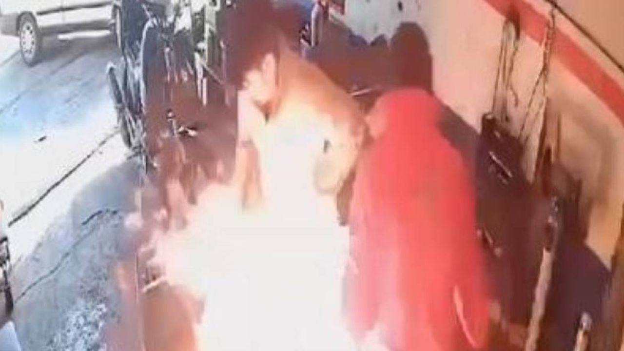 Olay, Sanayi sitesindeki bir tamirhanede meydana geldi. Edinilen bilgiye göre, bozulan motosiklet tamir için bir iş yerine götürüldü. Burada arızanın nedenini bulmak isteyen 2 kişi, elektrik kablolarını kontrol ettiği sırada motosiklet alev aldı. Şahıslardan biri yangını söndürmek için şişenin ağzını açarak yanıcı maddeyi alevin üzerine serpti. Yanıcı maddenin bir anda parlamasıyla birlikte alevlerin arasında kalan 2 kişi koşarak dışarı kaçtı. Şahıslardan biri yine alevi söndürmek için battaniye attı fakat o da tutuşarak yanmaya başladı. Diğer esnafların yangın tüpü ile müdahale ettiği alevler kontrol altına alınarak söndürüldü. O anlar güvenlik kameralarına saniye saniye yansırken motosiklette ve iş yerinde maddi hasar meydana geldi.