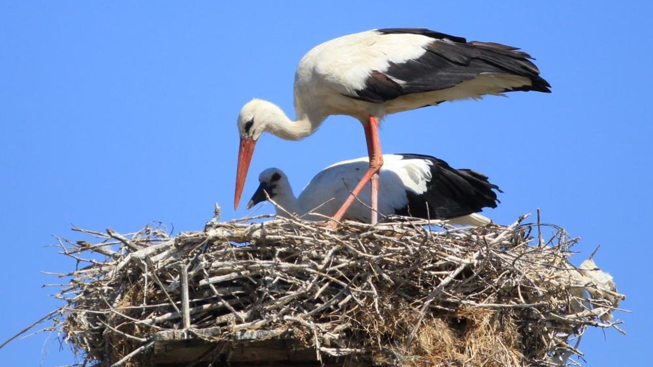 Yumurtadan çıkan yavrular ve onları besleme telaşı içinde yiyecek bulmak için kanatlanan anne ve baba leylekler, mahallede adeta bir görsel şölen oluşturuyor.