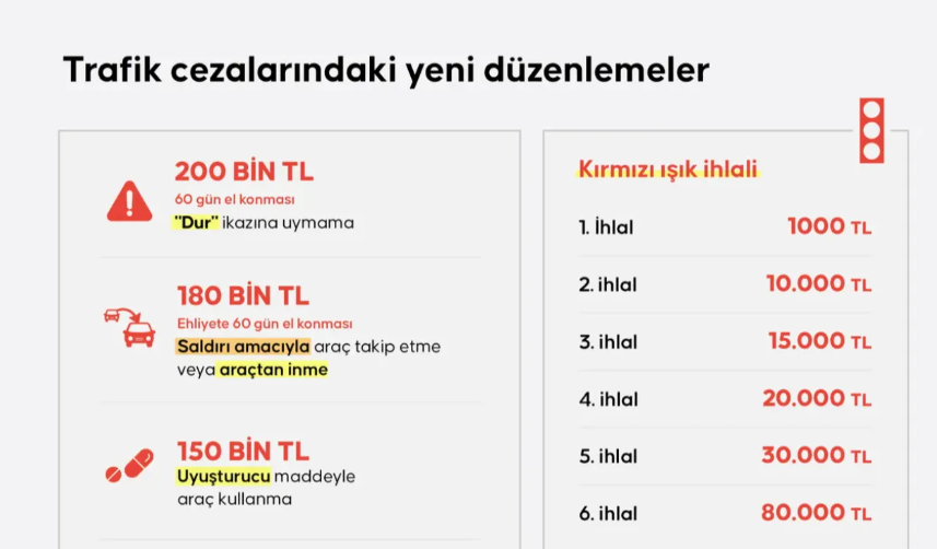 Kırmızı ışık ihlali yapan sürücülere, son ihlalin gerçekleştiği tarihten geriye doğru 1 yıl içinde ikinci defa ihlal edilmesi halinde 10 bin lira, üçüncü defa ihlal edilmesi halinde 15 bin lira, dördüncü defa ihlal edilmesi halinde 20 bin lira, beşinci defa ihlal edilmesi halinde 30 bin lira, altıncı defa ihlal edilmesi halinde 80 bin lira idari para cezası verilecek.