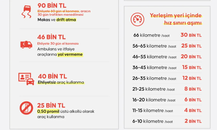 Hız ölçen teknik cihaz veya çeşitli teknik usullerle yapılan tespit sonucu yönetmelikte belirlenen hız sınırlarını, yerleşim yeri içinde, 6-10 kilometre/saat aşanlara 2 bin lira, 11-15 kilometre/saat aşanlara 4 bin lira, 16-20 kilometre/saat aşanlara 6 bin lira, 21-25 kilometre/saat aşanlara 8 bin lira, 26-35 kilometre/saat aşanlara 12 bin lira, 36-45 kilometre/saat aşanlara 15 bin lira, 46-55 kilometre/saat aşanlara 20 bin lira, 56-65 kilometre/saat aşanlara 25 bin lira, 66 kilometre/saat ve daha fazlasını aşanlara 30 bin lira idari para cezası verilecek.