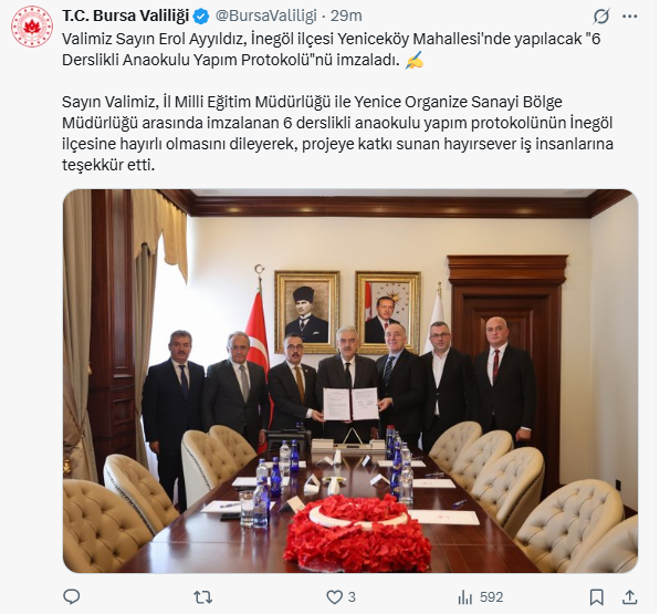 Vali Ayyıldız, Bursa İl Milli Eğitim Müdürlüğü ile Yenice Organize Sanayi Bölge Müdürlüğü arasında gerçekleştirilen protokolün İnegöl’e hayırlı olmasını temenni ederken, projeye destek veren hayırsever iş insanlarına da teşekkür etti.