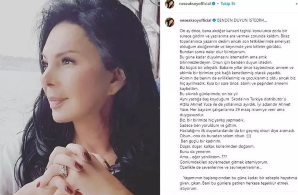 "Sevgili dostum, ablam, oyuncu Neşe Aksoy şu an İzmir'de hastanede yatıyor. Kötü hastalık ile mücadele ediyor ama inanıyorum ki atlatacak. Ona acil şifalar diliyorum ve dualarınızı göndermenizi rica ediyorum."