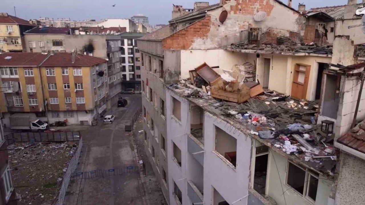 İstanbul Zeytinburnu’nda kentsel dönüşüm aşamasındaki binanın çatısından kopan beton parçaları, park halindeki araçların üzerine düşmüştü. Bina havadan görüntülendi.