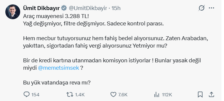 X hesabında bir paylaşım yapan Dikbayır, "Araç muayenesi 3 bin 288 TL! Yağ değişmiyor, filtre değişmiyor. Sadece kontrol parası. Hem mecbur tutuyorsunuz hem fahiş bedel alıyorsunuz. Zaten arabadan, yakıttan, sigortadan fahiş vergi alıyorsunuz yetmiyor mu? Bir de kredi kartına utanmadan komisyon istiyorlar! Bunlar yasak değil miydi?" ifadelerini kullandı.